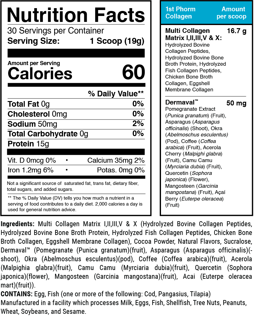1st Phorm’s Collagen also contains 50mg per serving of Dermaval™. Dermaval™ is a revolutionary phytonutrient-rich complex that increases and helps maintain healthy levels of elastin in the body.* Collagen is great at building structure, while elastin is responsible for elasticity and firmness of the skin.
