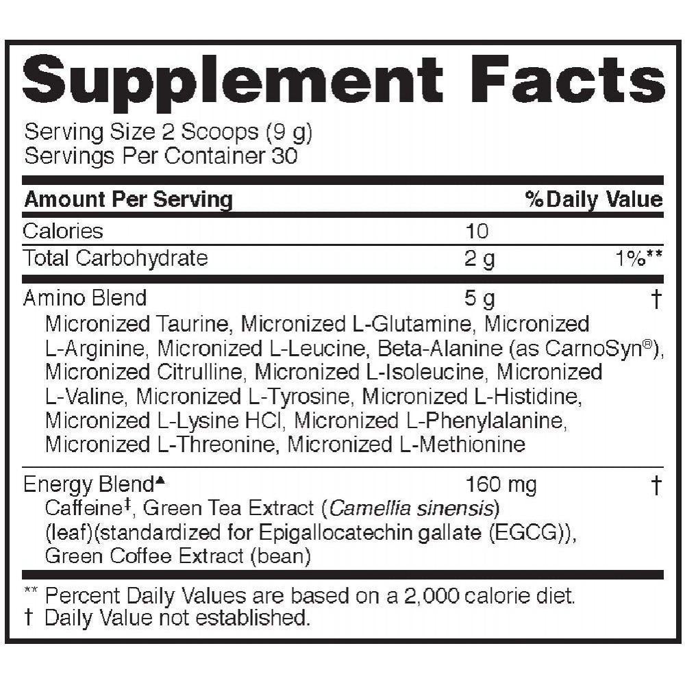 Mix up ESSENTIAL AMIN.O. ENERGY anytime you want a boost of energy, focus and muscle recovery support. Each serving provides 100 mg of caffeine from natural sources to support energy and focus along with 5 grams of amino acids for muscle support.